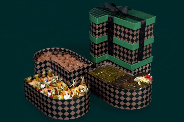 canape : triangle cheese _ cobba labna 27 pcs vine leaves : lemon _ pomegranate 50 pcs sweet : 250 g