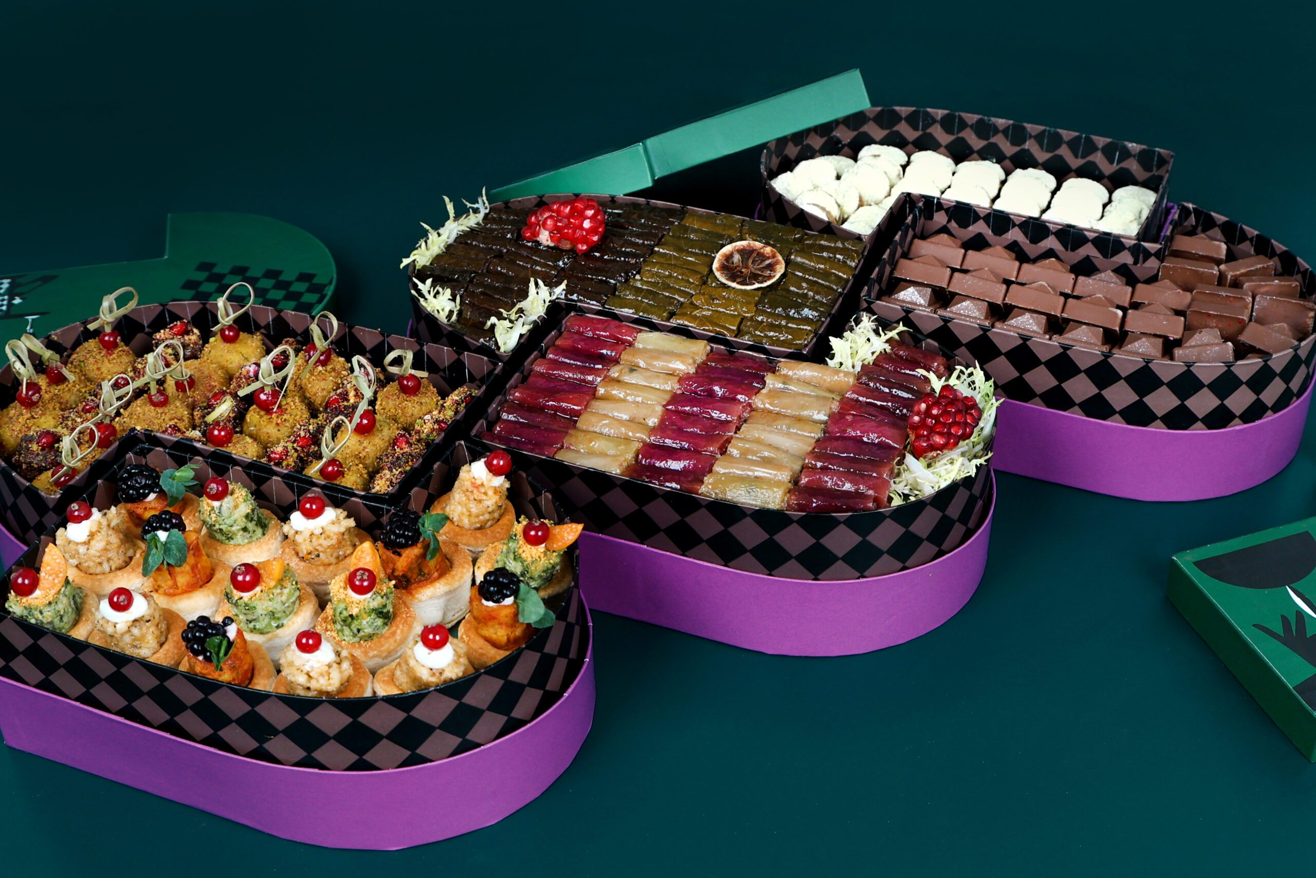 vine leaves lemon and pomegranate 56 pcs_ red and white cabbage 46 pcs_ bouche 16 pcs_ mexican cobba 14 pcs_ eggplant cobba 16 pcs_ roskit 350 g_ baklawa cream 350 g