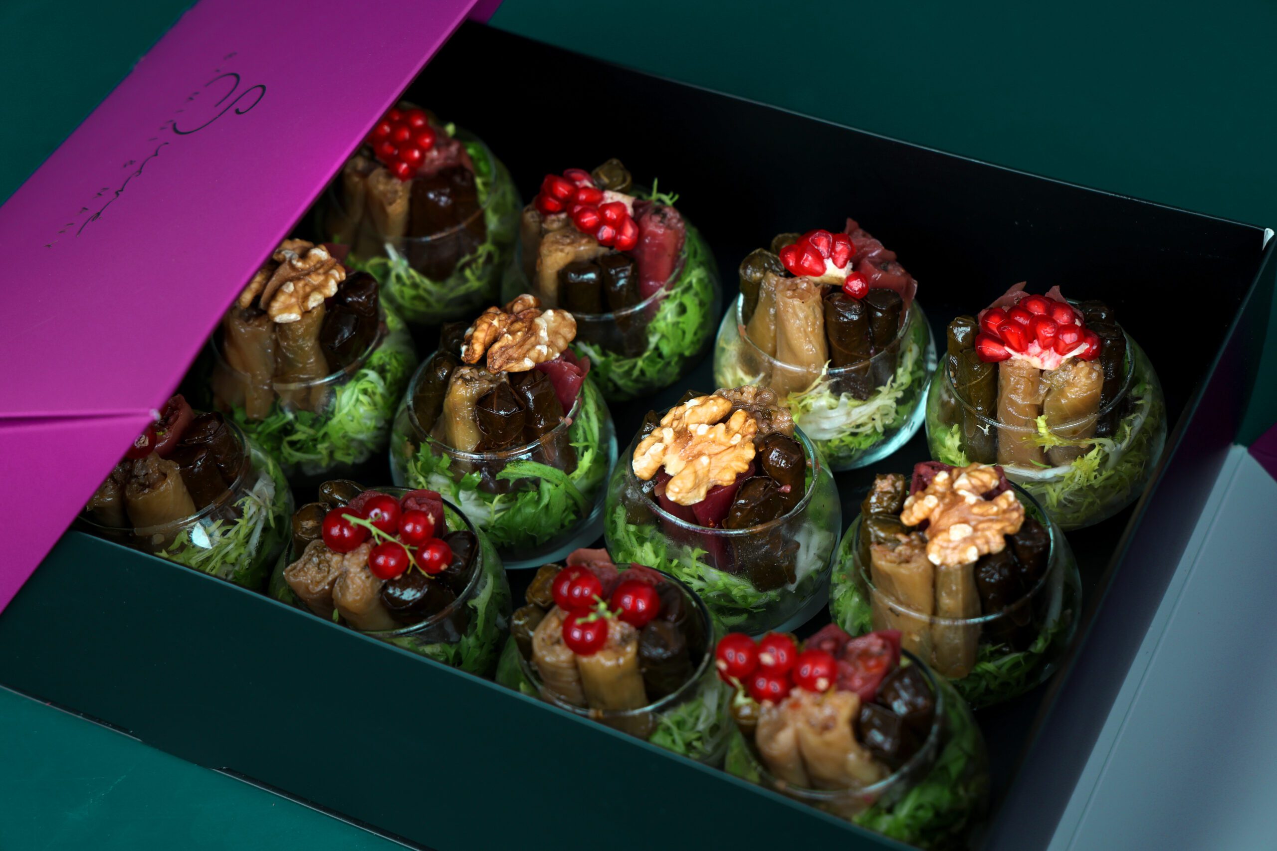 12 glasses in box lemon _ pomegranate _ white cabbage _ red cabbage